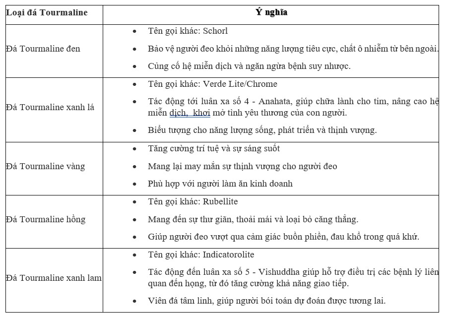 Tourmaline là loại đá đa màu sắc. Mỗi một phiên bản màu sắc lại mang đến những công dụng và ý nghĩa khác nhau. Cụ thể: