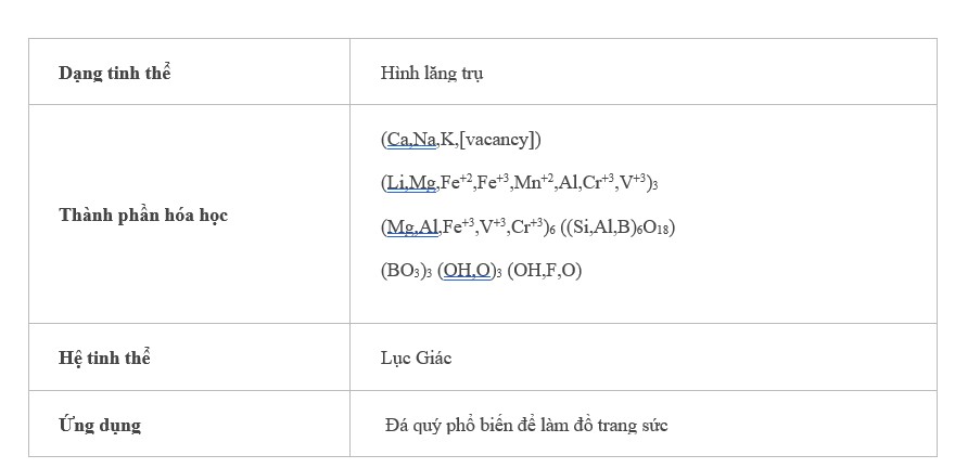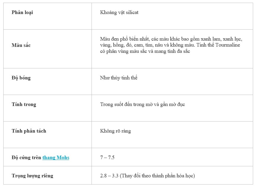 Dưới đây là bảng tổng hợp thông tin chi tiết về cấu trúc vật lý và hóa học của đá Tourmaline.