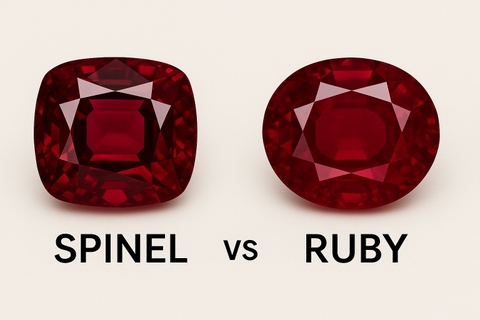 Cả hai loại đá đều có màu đỏ rực rỡ, độ trong cao và thường được tìm thấy cùng nhau trong tự nhiên. Trước khi có thiết bị phân tích hiện đại, Spinel và Ruby gần như không thể phân biệt bằng mắt thường – đây cũng là lý do Spinel bị đánh giá thấp hơn so với giá trị thật trong quá khứ.