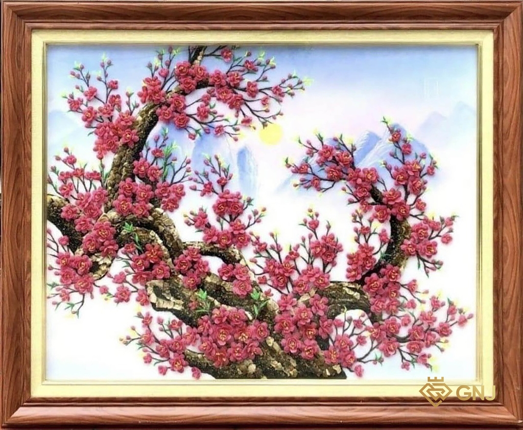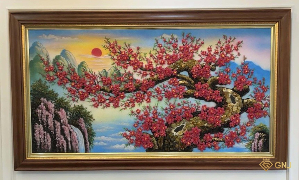 Tranh đá quý đào đỏ được cơ sở chế tác tranh đá quý GNJ làm từ 100% đá quý và đá bán quý tự nhiên, đảm bảo không phai màu, mối mọt.